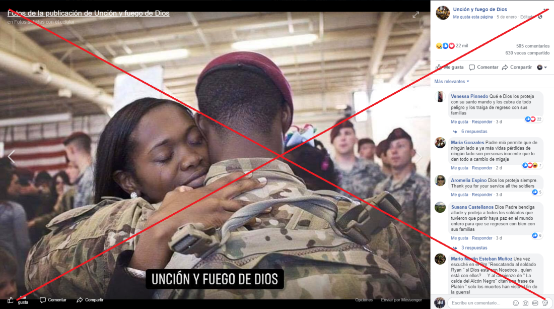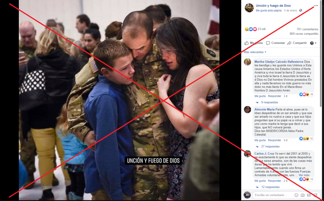 En realidad, esta fotografía muestra un reencuentro, no una despedida, como se afirma en las publicaciones virales. Por medio de la búsqueda inversa de Google fue posible encontrar un artículo en la página de una radio de Carolina del Norte, con el título “Fotos: Captando la emoción del regreso de dos militares”.