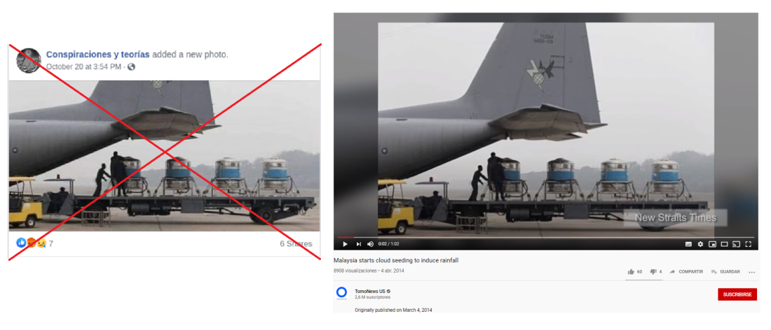 En una de ellas se aprecia a un par de operarios maniobrando tanques cerca de un avión. La fotografía en realidad data de 2014, como se puede ver en este video, y muestra una operación de “siembra de nubes" en Malasia llevada adelante por las autoridades de ese país.