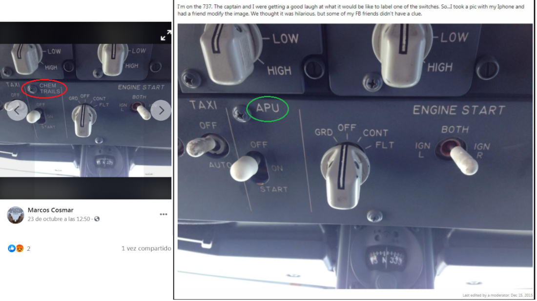 Otra de las fotos viralizadas muestra un tablero de control de un avión con la inscripción “chemtrails”. Pero la foto es un montaje.