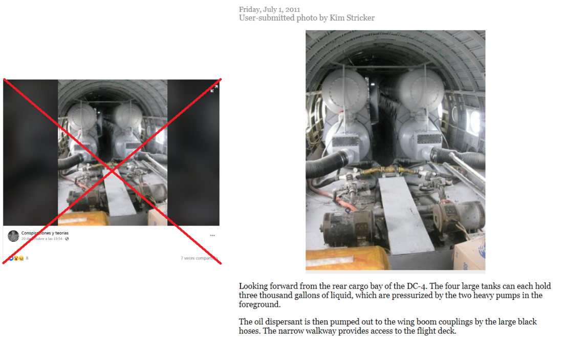 Otra de las fotos de este tipo en realidad data al menos de 2011 y muestra cuatro grandes tanques de líquido dispersante de petróleo a bordo de una aeronave DC-4.
