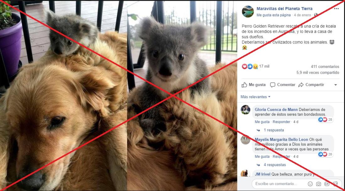 “Perro Golden Retriever rescata a una cría de koala de los incendios en Australia, y lo lleva a casa de sus dueños. Deberíamos ser civilizados como los animales”, afirma una publicación del 4 de enero de 2020, acompañada de un montaje en el que se puede ver a un pequeño koala montado sobre un can. La misma versión ha sido publicada por varios usuarios en Facebook (1, 2, 3, 4, 5, 6, 7) y Twitter (1, 2, 3, 4), y fue compartida más de 20.000 veces.