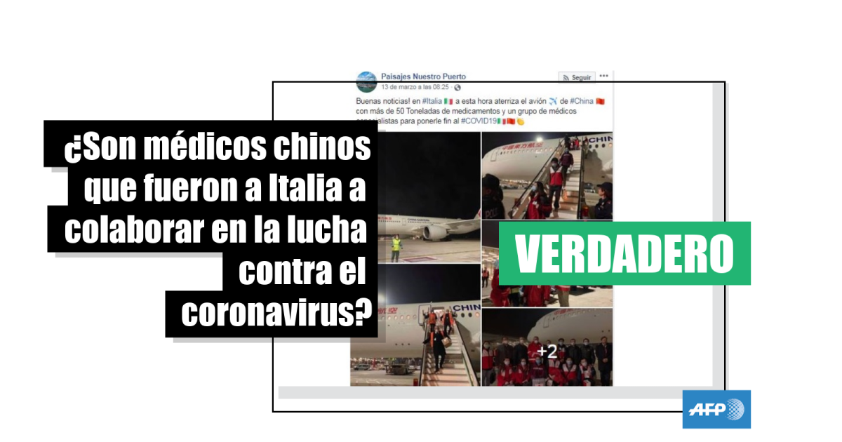 “Buenas noticias! en #Italia a esta hora aterriza el avión de #China con más de 50 Toneladas de medicamentos y un grupo de médicos especialistas para ponerle fin al #COVID19”, afirma una publicación en Facebook del 13 de marzo de 2020, en la que se muestran varias fotos de un grupo de personas descendiendo de un avión de la compañía Eastern China con abrigos de la Cruz Roja y máscaras tapabocas.