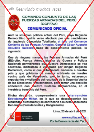 AFP Factual revisó el sitio web del Comando Conjunto peruano, y sus cuentas en Twitter, Facebook e Instagram, sin encontrar coincidencias con la misiva que circula.