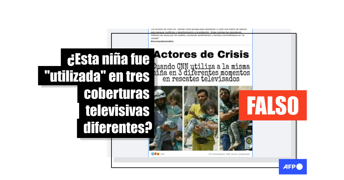 En cuatro de las fotografías, tomadas en un lapso de 1 minuto y 12 segundos, según los metadatos de las mismas consultados por el equipo de verificación de la AFP, se identifica a la niña que, en su rescate, pasa por los brazos de tres hombres diferentes: un Casco Blanco, un hombre con camisa a cuadros, y un rescatista vestido de amarillo.