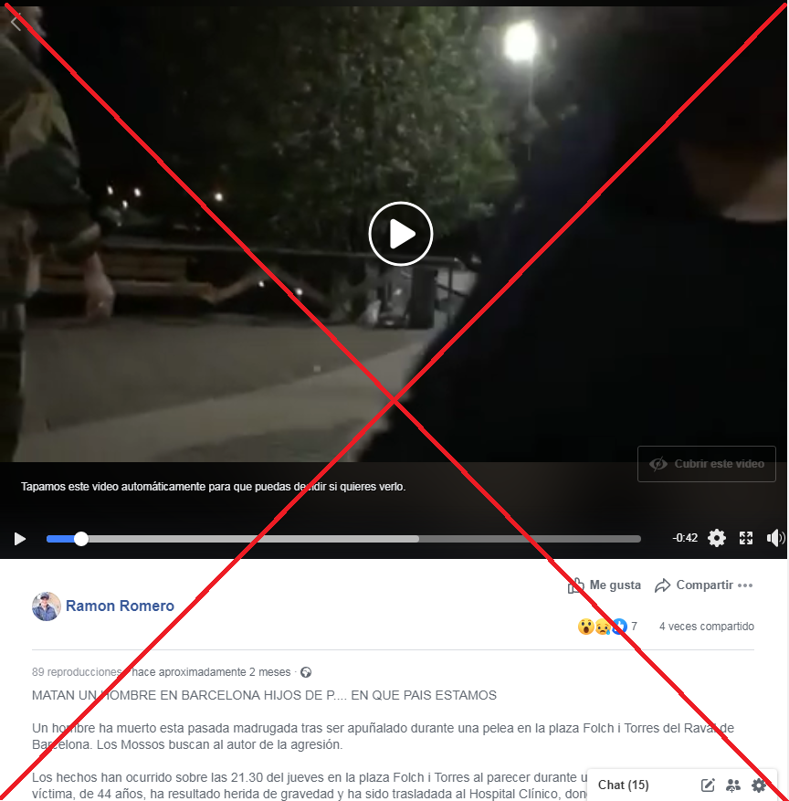A finales de julio de 2019 circularon en cadena por WhatsApp imágenes de un apuñalamiento, dando por hecho que habían tenido lugar en el barrio del Raval de Barcelona. A partir del 27 de julio, el vídeo se difundió también por Facebook: “MATAN UN HOMBRE EN BARCELONA HIJOS DE P.... EN QUE PAIS ESTAMOS. Un hombre ha muerto esta pasada madrugada tras ser apuñalado durante una pelea en la plaza Folch i Torres del Raval de Barcelona. Los Mossos buscan al autor de la agresión. Los hechos han ocurrido sobre las 21.30 del jueves en la plaza Folch i Torres al parecer durante una pelea en plena calle. La víctima, de 44 años, ha resultado herida de gravedad y ha sido trasladada al Hospital Clínico, donde ha fallecido poco después (...)”, dice una de las publicaciones que acompaña el vídeo.