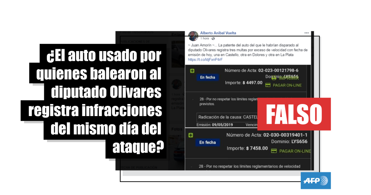 El tuit original, publicado por el portal de noticias El Canciller, decía: “AHORA. La patente del auto identificado como de los atacantes de Héctor Olivares tiene multas de hoy por exceso de velocidad en La Plata, Dolores y Castelli”, e iba acompañado de una captura de pantalla del sitio web del gobierno de la provincia de Buenos Aires en la que cada multa tiene como fecha de emisión el 9 de mayo de 2019.