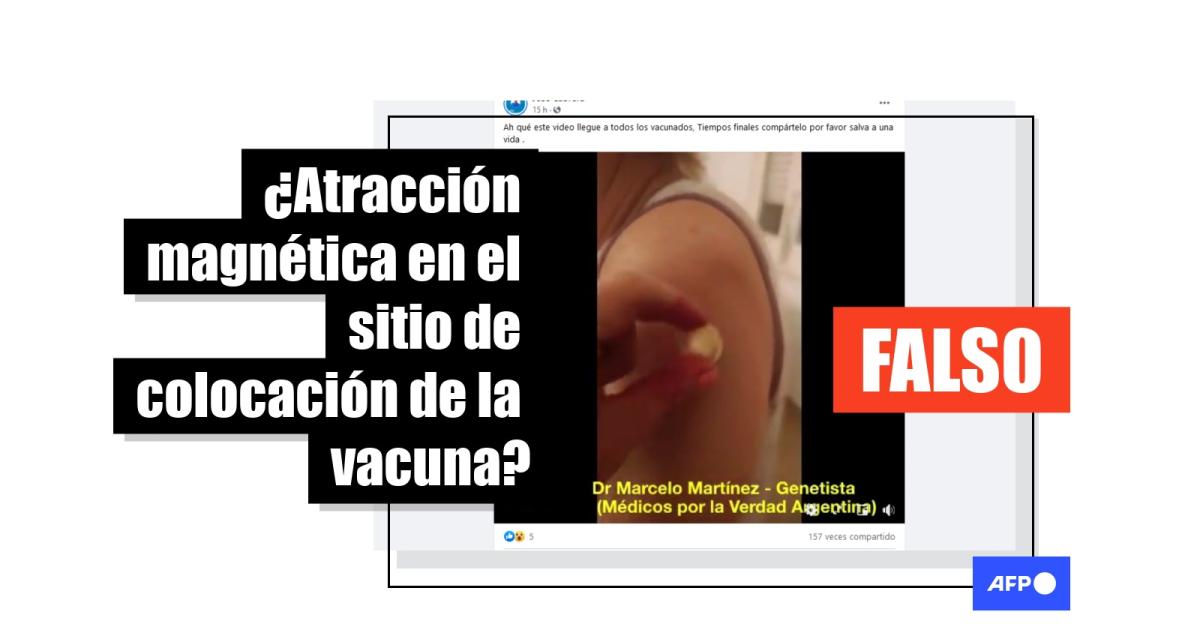 “Estoy con una paciente que ha sido vacunada con la vacuna AstraZeneca. Justo tenía un imán acá en el consultorio y estoy haciendo la prueba de que el imán sí se pega en el lugar donde ella recibió la vacuna”, se escucha en una de las secuencias, que circula en Facebook (1, 2, 3) Twitter e Instagram, y supuestamente muestra el brazo de una mujer llamada “Patri”, sobre el que otra deja fijado un pequeño imán.