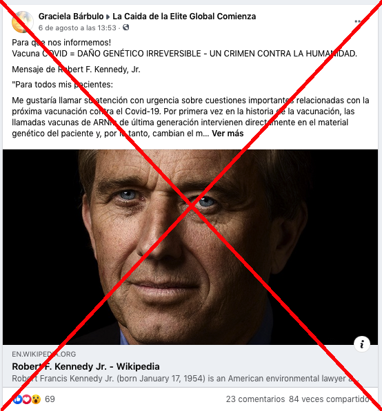 Las publicaciones, a veces acompañadas por un enlace a la entrada en Wikipedia de Robert Kennedy Jr., aseguran que dedica el mensaje “a sus pacientes”. Sin embargo, él no es médico ni profesional de la salud. Es un abogado ambientalista estadounidense y fundador de Children’s Health Defense (CHD), una plataforma que busca “proteger” a los niños de los efectos tóxicos de la vacunación y combatir los discursos médicos instalados.