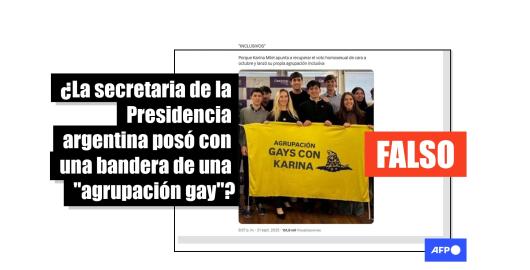 Imagen Elecciones Argentina 2025 Publicado el 23/09/2025 Karina Milei no posó con una bandera que dice “Agrupación gays con Karina”; la foto es un montaje