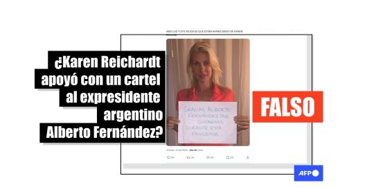 Imagen Elecciones Argentina 2025 Publicado el 15/10/2025 La foto de la argentina Karen Reichardt con un cartel en apoyo a Alberto Fernández es un montaje
