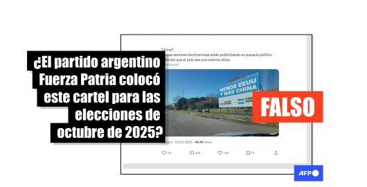 Imagen Elecciones Argentina 2025 Publicado el 16/10/2025 Un cartel del partido argentino Fuerza Patria con el mensaje “menos EEUU y más China” es un montaje
