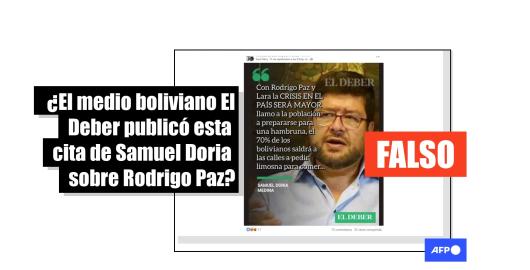 Imagen Elecciones Bolivia 2025 Publicado el 23/09/2025 Es un montaje la placa de El Deber de Bolivia con una cita de Samuel Doria en contra de Rodrigo Paz