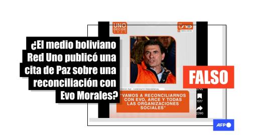 Imagen Elecciones Bolivia 2025 Publicado el 04/09/2025 Es falso que Red Uno de Bolivia publicó que el candidato Paz se reconciliará con Evo Morales