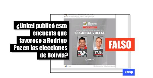 Imagen Elecciones Bolivia 2025 Publicado el 03/10/2025 Es un montaje la placa de Unitel que informa que Paz lidera la intención de voto en Bolivia