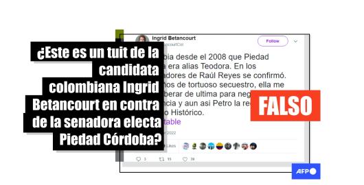Imagen Elecciones Colombia 2022 Publicado el 26/04/2022 Tuit de la candidata colombiana Ingrid Betancourt sobre Piedad Córdoba surge de una cuenta apócrifa