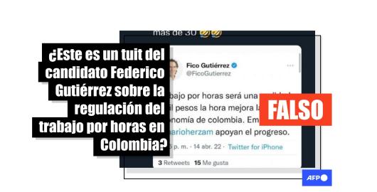 Imagen Elecciones Colombia 2022 Publicado el 28/04/2022 El supuesto tuit de Gutiérrez sobre pagar 6.000 pesos por hora de trabajo en Colombia es falso