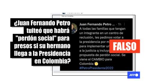 Imagen Elecciones Colombia 2022 Publicado el 29/04/2022 Es falso el supuesto tuit del hermano de Petro que habla de perdón social para presos en Colombia