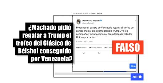 Imagen Venezuela Publicado el 20/03/2026 Es falso un mensaje en el que Machado ofrece a Trump el título de béisbol conseguido por Venezuela