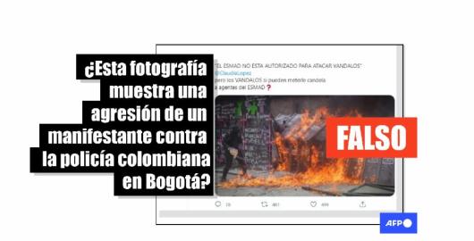 Imagen Publicado el 08/07/2021 Esta foto de un encapuchado prendiendo fuego a policías no fue tomada en Bogotá, sino en México