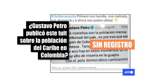 Imagen Publicado el 14/09/2021 No hay registro de que Petro tuiteara que la costa es la región “menos intelectual” de Colombia