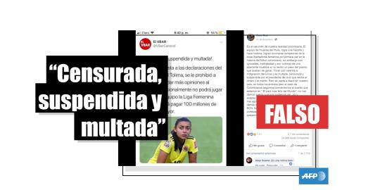 Imagen Publicado el 31/12/2018 ¿Una futbolista colombiana fue multada y suspendida por criticar al presidente de un equipo? Falso
