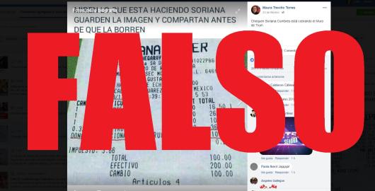 Imagen Publicado el 16/07/2018 No. La cadena mexicana de supermercados Soriana no cobra 10 pesos para destinarlos a la construcción del muro fronterizo propuesto por Donald Trump