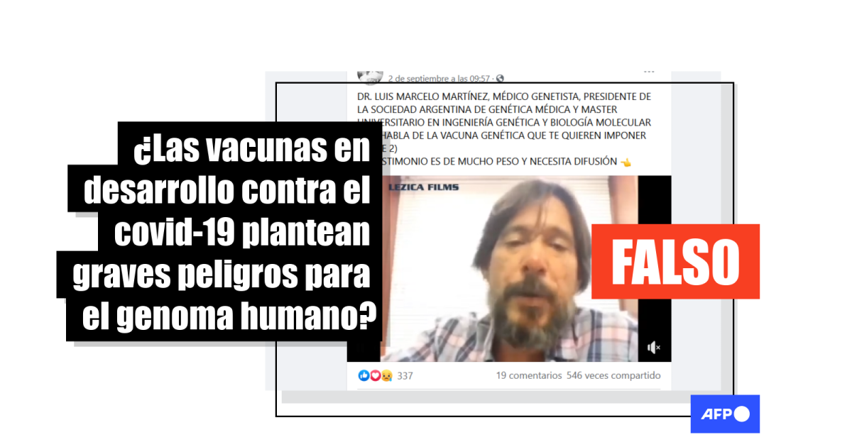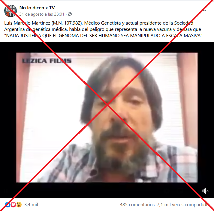 El video circula en Facebook (1, 2, 3), Twitter (1, 2) e Instagram. “Los peligros que presenta la Nueva Vacuna contra el C0VID… Médico Genetista Luis Marcelo Martínez (M.N. 107.982). Magíster en Ingeniería Genética y Biología Molecular. Actual Presidente de la Sociedad Argentina de Genética Médica. ‘NADA JUSTIFICA QUE EL GENOMA HUMANO SEA MANIPULADO A ESCALA MASIVA’”, se lee en una de las publicaciones.