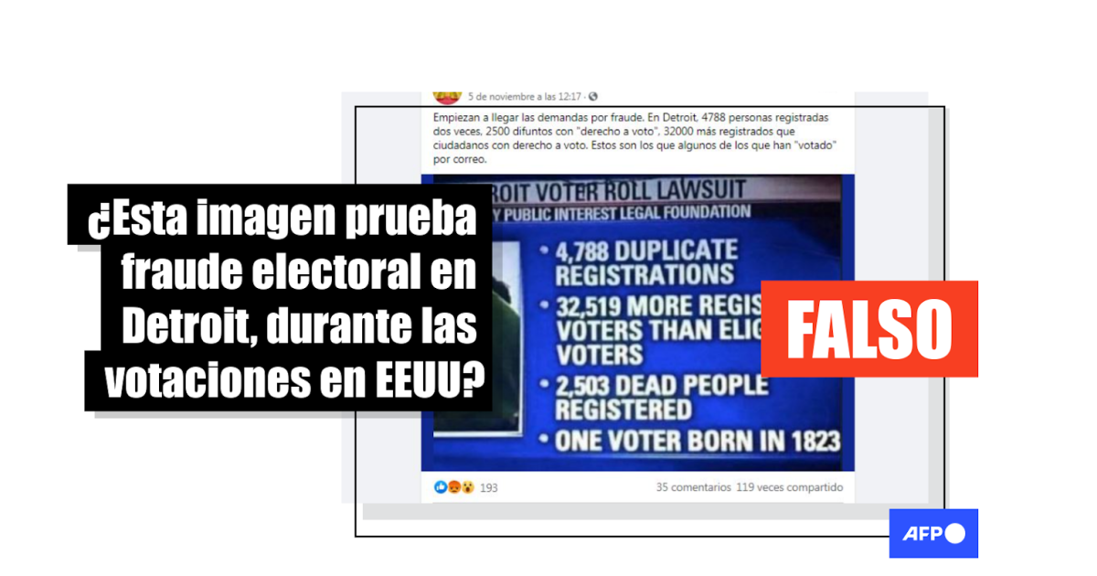 “Empiezan a llegar las demandas por fraude. En Detroit, 4788 personas registradas dos veces, 2500 difuntos con ‘derecho a voto’, 32000 más registrados que ciudadanos con derecho a voto”, dice una de las publicaciones difundidas en Facebook (1, 2) que denuncian un supuesto fraude electoral en esta ciudad de Michigan, estado donde ganó el candidato demócrata Joe Biden.