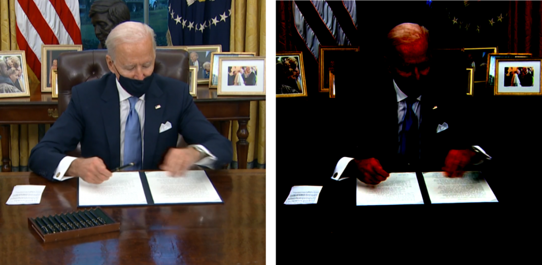 Joe Biden firma una serie de órdenes en Washington, DC después de ser juramentado el 20 de enero de 2021 (izq) y versión editada (Jim Watson/ AFP)