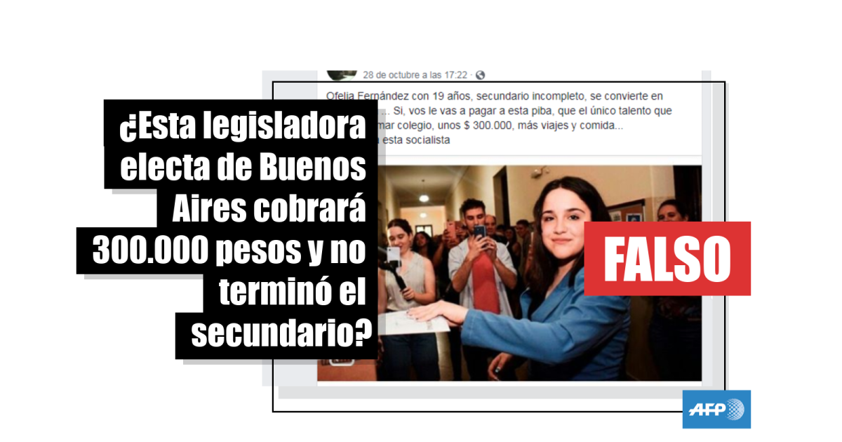 “Ofelia Fernández con 19 años, secundario incompleto, se convierte en legisladora ... Si, vos le vas a pagar a esta piba, que el único talento que tiene es tomar colegio, unos $ 300.000, más viajes y comida...Aplausos a esta socialista”, dice una publicación en Facebook (1, 2, 3, 4), donde la desinformación fue compartida más de 20.000 veces.