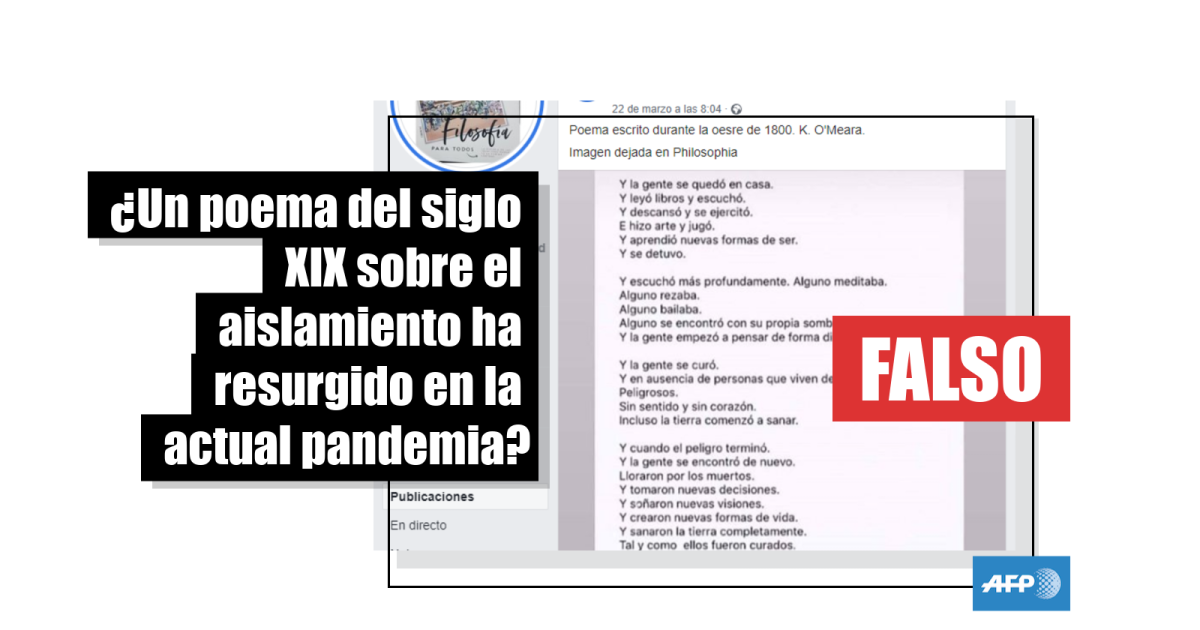 “Miren este poema escrito hace aprox 220 años [sic] ”, dice el encabezado de una publicación en Facebook que acompaña a un poema de cuatro estrofas con una reflexión sobre el aislamiento debido a la pandemia del nuevo coronavirus. Al final de la última estrofa se afirma que las líneas fueron escritas “durante la epidemia de peste en 1800” por K. O’Meara.