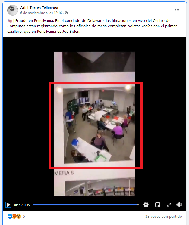 “Fraude en Pensilvania. En el condado de Delaware, las filmaciones en vivo del Centro de Cómputos están registrando cómo los oficiales de mesa completan boletas vacías con el primer casillero, que en Pensilvania es Joe Biden”, anuncia otra publicación, que incluye el mismo video, con una voz en inglés que asegura que la policía también está involucrada ya que, encontrándose en la sala, no hace nada para evitar el fraude.