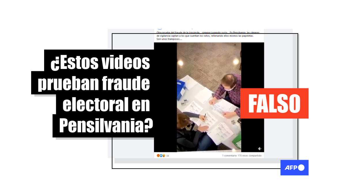 “En Pensilvania, las cámaras de vigilancia captan a los que cuentan los votos, rellenando ellos mismos las papeletas. Son unos tramposos”, se lee en una publicación en Facebook que incluye un video de 1.35 minutos de duración, en el que puede verse a un hombre y una mujer revisando y escribiendo sobre papeles.