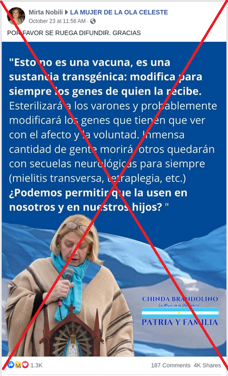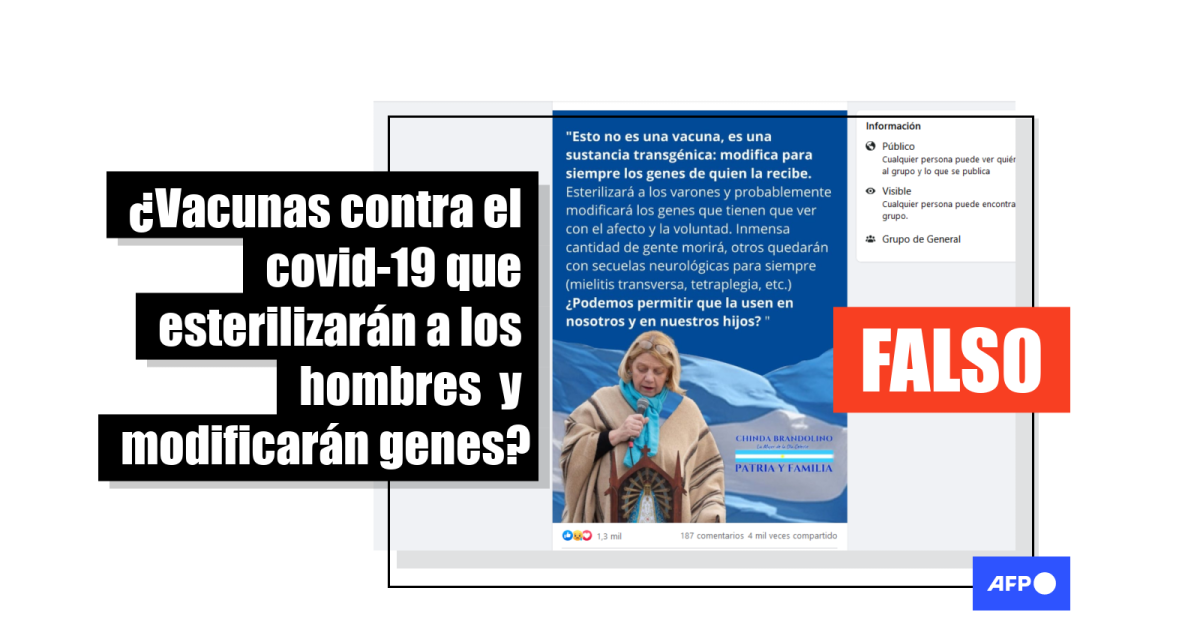 “Esto no es una vacuna, es una sustancia transgénica: modifica para siempre los genes de quien la recibe”, se lee en un meme que circula en Facebook (1, 2, 3), en el que puede verse también la imagen de Chinda Brandolino, médica legista y referente del grupo “Médicos por la verdad” en Argentina, quien ha hecho numerosas presentaciones públicas y en línea en las que niega la pandemia.