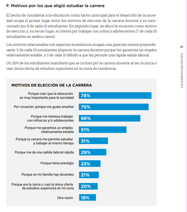 Según el reporte, los motivos relacionados con aspectos económicos ocupan una posición menos preponderante: “5 de cada 10 estudiantes eligieron la carrera docente porque les garantiza un empleo relativamente estable, y 3 de cada 10 debido a que les permite una rápida salida laboral”.