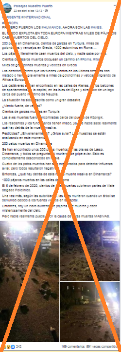 "EL MIEDO EXPLOTA EN TODA EUROPA MIENTRAS MILES DE PÁJAROS CAEN MUERTOS DEL CIELO [sic]”, alega una publicación en Facebook, compartida junto a tres imágenes en las que se ve gran cantidad de aves muertas.