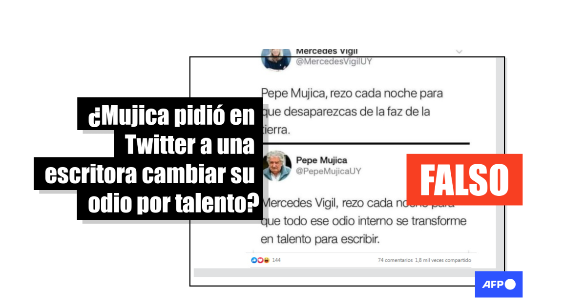 “Pepe Mujica, rezo cada noche para que desaparezcas de la faz de la tierra”, indica un tuit atribuido a Vigil. Debajo aparece la supuesta respuesta del expresidente uruguayo José Mujica (2010-2015): “Mercedes Vigil, rezo cada noche para que todo ese odio se transforme en talento para escribir”. Las capturas de pantalla del presunto intercambio comenzaron a circular en septiembre de 2018 en Facebook y Twitter.