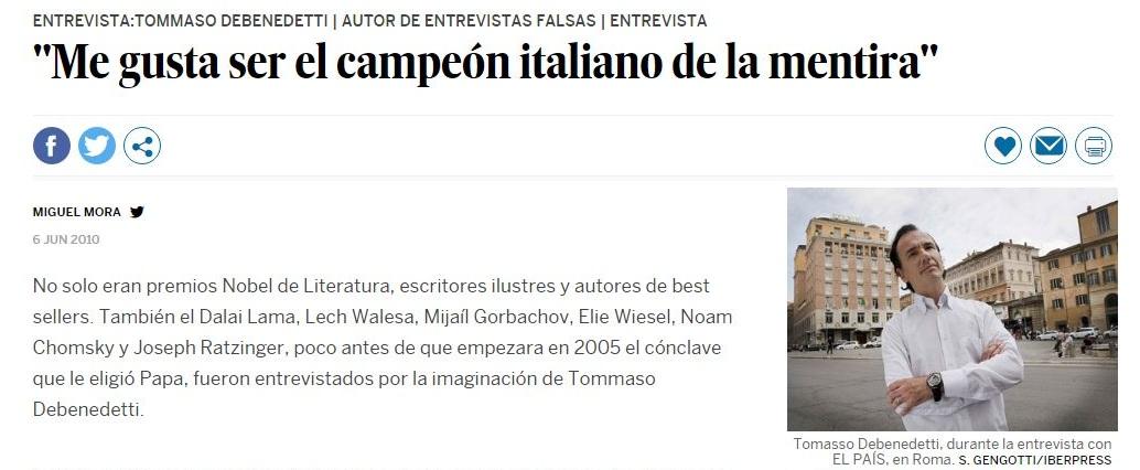En un artículo escrito para El Mundo de España, el italiano explica cómo se convirtió en un exitoso influenciador de las noticias falsas: “Yo, Tommaso Debenedetti, llegué a inventar 80 entrevistas en el transcurso de un juego periodístico y literario que duró más de 10 años (...) Ahora me dedico a crear falsas cuentas de Facebook y Twitter de personalidades importantes sin otro propósito que el de descubrir, como diría Vargas Llosa, la verdad oculta de las mentiras.”