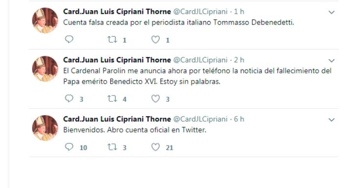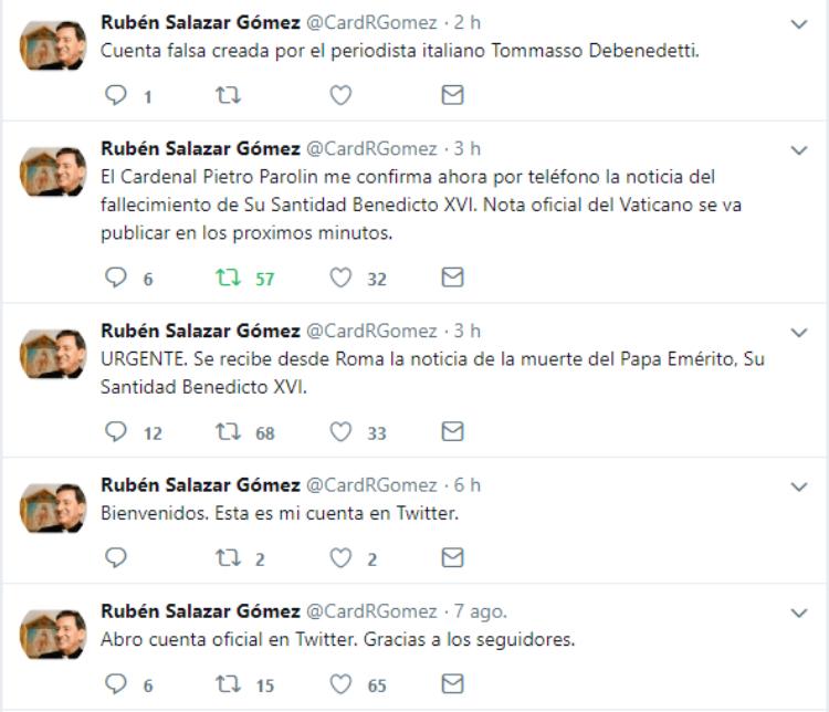 La noticia se publicó por primera vez desde una cuenta de Twitter recién creada a nombre del presidente del Consejo Episcopal Latinoamericano, el cardenal Rubén Salazar. “URGENTE. Se recibe desde Roma la noticia de la muerte del Papa Emérito”, decía un mensaje publicado el pasado 8 de agosto y que fue seguido de otro con más detalles al respecto: “El Cardenal Pietro Parolin me confirma ahora por por teléfono la noticia del fallecimiento de su Santidad Benedicto XVI.”