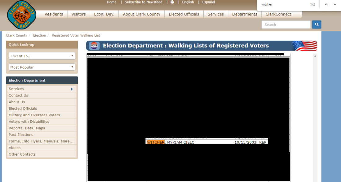 AFP pudo comprobar, en la página del Condado de Clark en Nevada, que Myriam Witcher está registrada en la lista de votantes de Estados Unidos y afiliada al Partido Republicano desde 2003. Este condado, que incluye a la ciudad de Las Vegas, es el lugar donde ha vivido Witcher. En el mismo portal, está registrada su acta de matrimonio, una propiedad y su dirección para votar, así como la de su esposo.