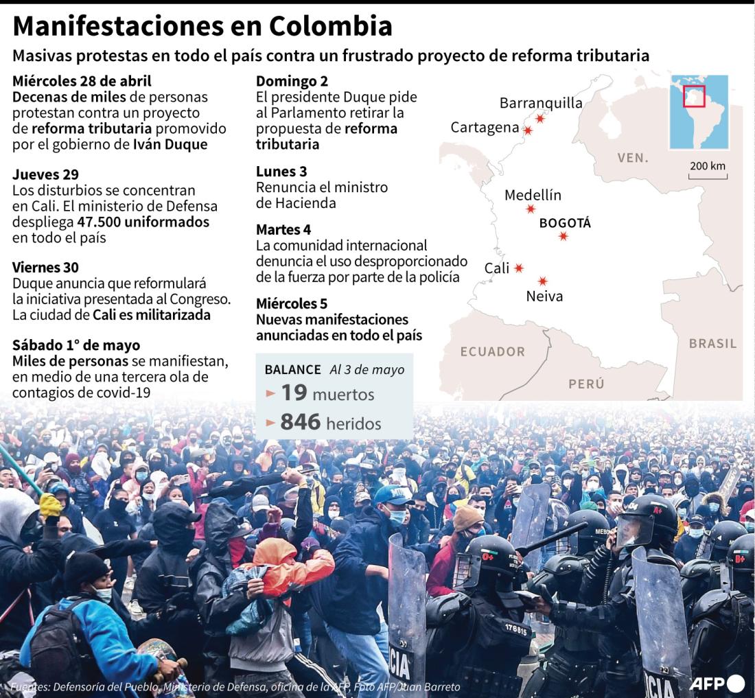 La publicación comenzó a compartirse a raíz de la represión emprendida durante las masivas protestas que comenzaron el pasado 28 de abril contra una propuesta de reforma tributaria promovida por el gobierno de Iván Duque. Si bien el proyecto fue retirado el 2 de mayo, las manifestaciones y el accionar de las fuerzas de seguridad continuaron, dejando un saldo de una veintena de muertos y más de 800 heridos al 5 de mayo.