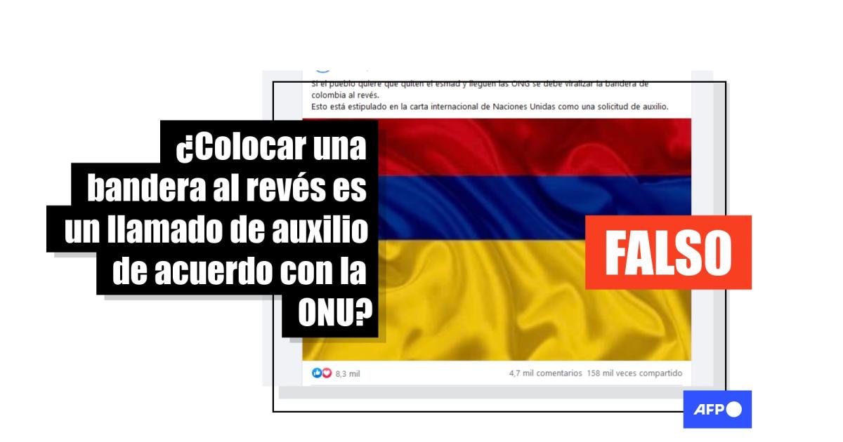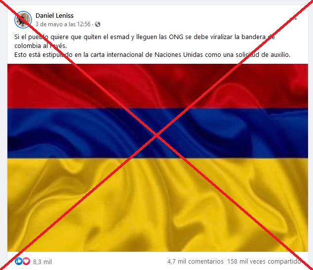 “Si el pueblo quiere que quiten el esmad [Escuadrón móvil antidisturbios de Colombia] y lleguen las ONG se debe viralizar la bandera de colombia al revés”, se lee en publicaciones compartidas en Facebook (1, 2, 3). “Esto está estipulado en la carta internacional de Naciones Unidas como una solicitud de auxilio”.
