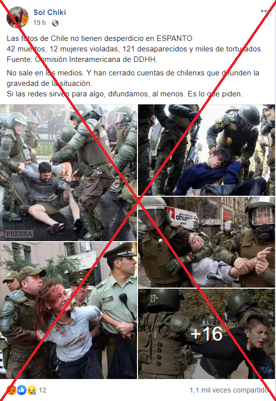 “Las fotos de Chile no tienen desperdicio en ESPANTO Chile 42 muertos, 12 mujeres violadas, 121 desaparecidos y miles de torturados. Fuente: Comisión Interamericana de DDHH. No sale en los medios. Y han cerrado cuentas de chilenxs que difunden la gravedad de la situación. Si las redes sirven para algo, difundamos, al menos. Es lo que piden”, se lee en la publicación del 1 de diciembre pasado, con 19 fotografías.