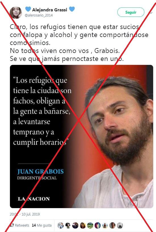 La foto que acompaña el texto, con el rostro de Grabois, fue tomada del video de una entrevista realizada en Infobae por el periodista Luis Novaresio en octubre de 2017, pero en ella Grabois no hace referencia alguna a los refugios que la ciudad de Buenos Aires ofrece a las personas sin hogar.
