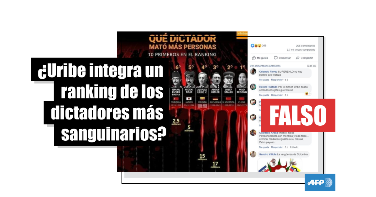 La infografía viral le atribuye a Uribe 15 millones de muertos, lo que supuestamente lo convierte en el cuarto “dictador” más sanguinario de un listado de diez mandatarios, superado únicamente por el alemán Adolf Hitler, el ruso Josef Stalin y el chino Mao Tse Tung.