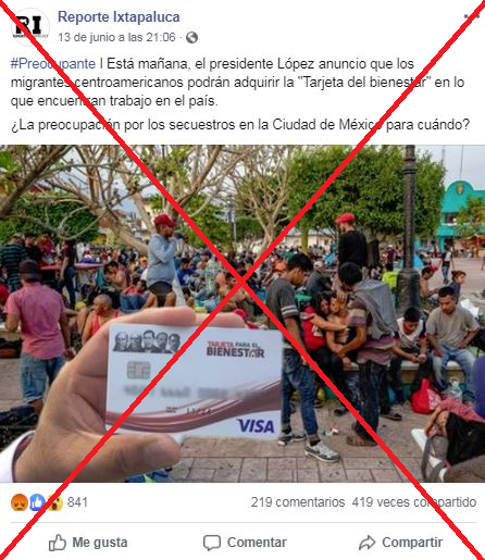“#Preocupante | Está mañana, el presidente López anuncio que los migrantes centroamericanos podrán adquirir la "Tarjeta del bienestar" en lo que encuentran trabajo en el país. ¿La preocupación por los secuestros en la Ciudad de México para cuándo?”, señala una publicación de Facebook que ha sido compartida 419 veces.