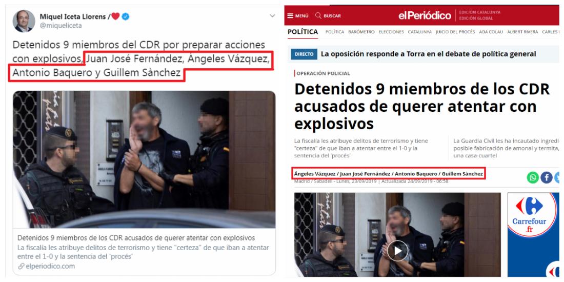 Otros tuits señalan que los nombres no son de los detenidos: “Los nombres que da son de los periodistas (...)”, mientras que otro se retracta de haber acusado al político, “@maticatradio me retracto del anterior twuit de Iceta. Son nombres de periodistas”.