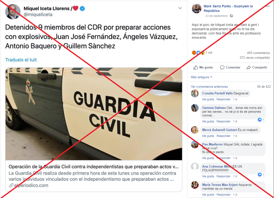 “Aquí el cerdo de Miquel Iceta apuntando a gente y exponiéndola públicamente cuando no hay nada demostrado, como hacía Rivera con los profesores inocentes”, dice (en catalán) una publicación en Facebook que adjunta una captura de pantalla de un tuit del político socialista Miquel Iceta, en el que se lee lo siguiente: “Detenidos 9 miembros del CDR por preparar acciones con explosivos, Juan José Fernández, Ángeles Vázquez, Antonio Baquero y Guillem Sànchez”.