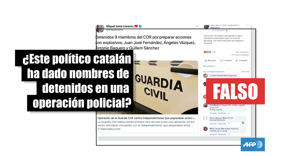 La publicación circula en Facebook desde el lunes 23 de septiembre, día en que la Guardia Civil realizó nueve detenciones en Cataluña contra separatistas de los CDR que supuestamente tramaban un complot terrorista.