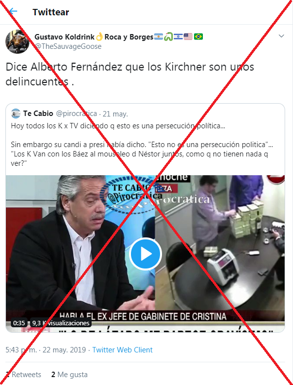 Por lo tanto, el cambio en el orden de las declaraciones hace parecer que cuando Fernández habló de un "delincuente" se refería al expresidente Néstor Kirchner. Y, en rigor, aludía a Lázaro Báez, el empresario amigo del matrimonio Kirchner.